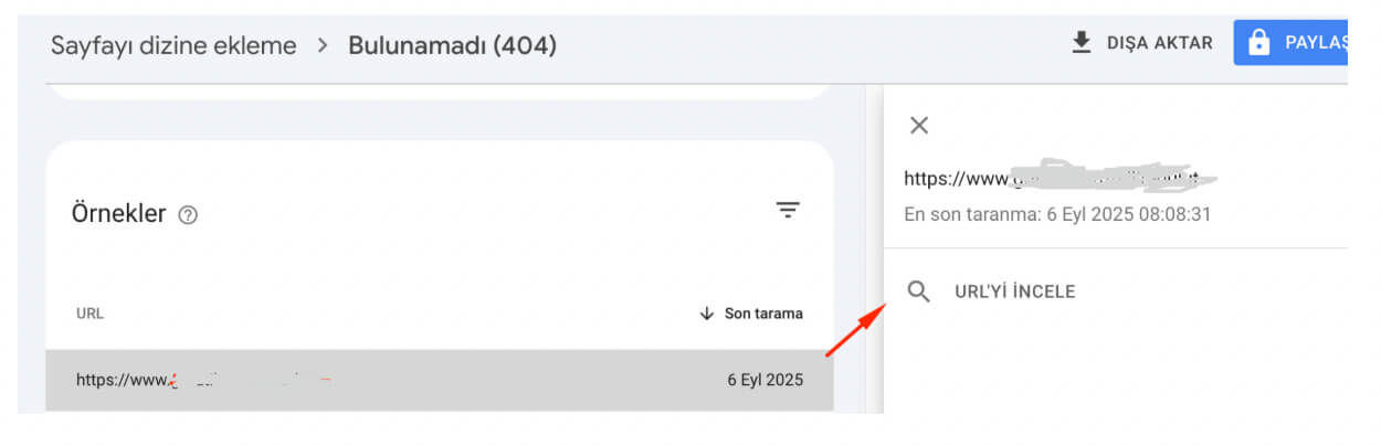 404 hatasında görünen bir sayfanın üzerine tıklayıp, “URL’Yİ İNCELE” ye basın.