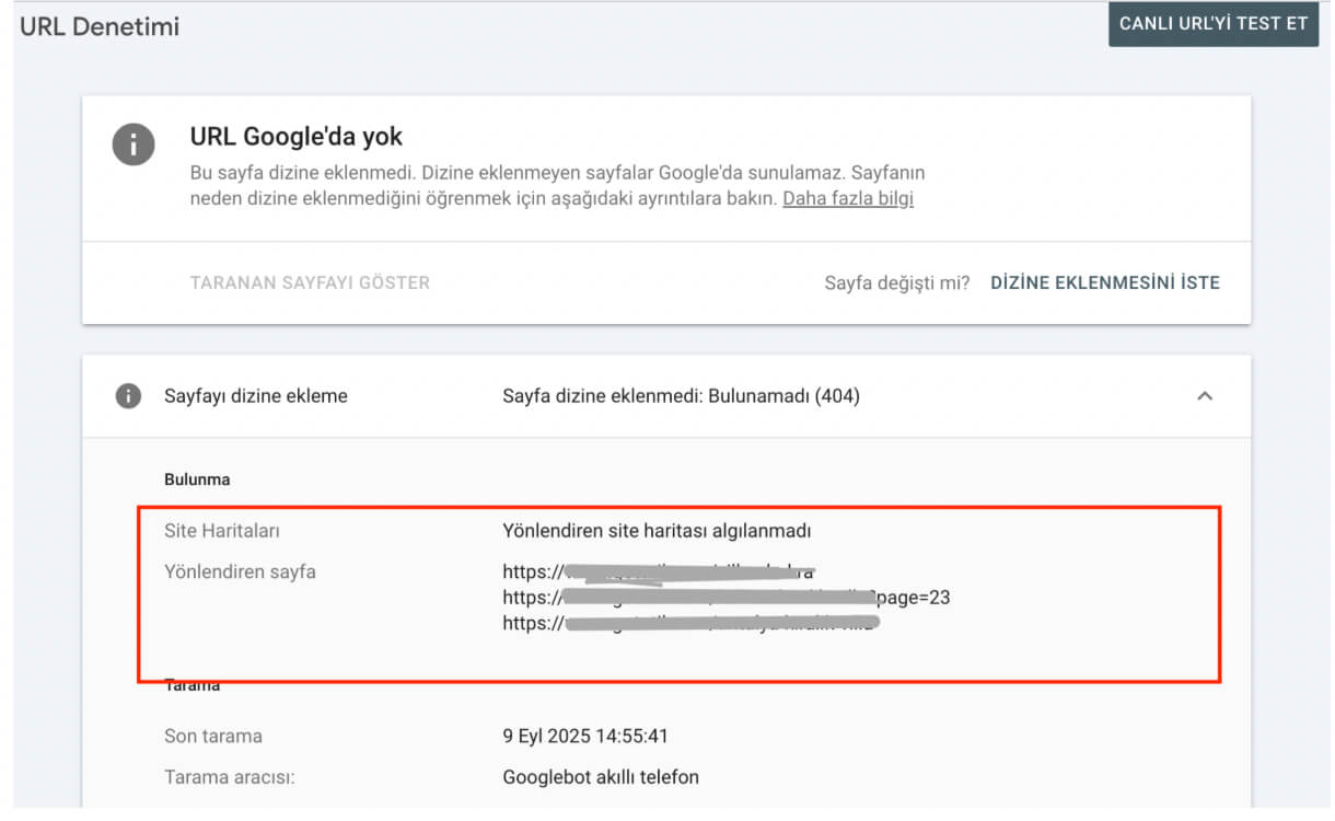 Bu ekrana ulaşıldığında “Yönlendiren sayfa” kısmında eğer bağlantılar varsa, bu sayfalardan 404 sunan ilgili sayfaya bir bağlantı verilmiş demektir. Bu sayfaları ziyaret edip, hatalı bağlantılar olup olmadığını kontrol edin.